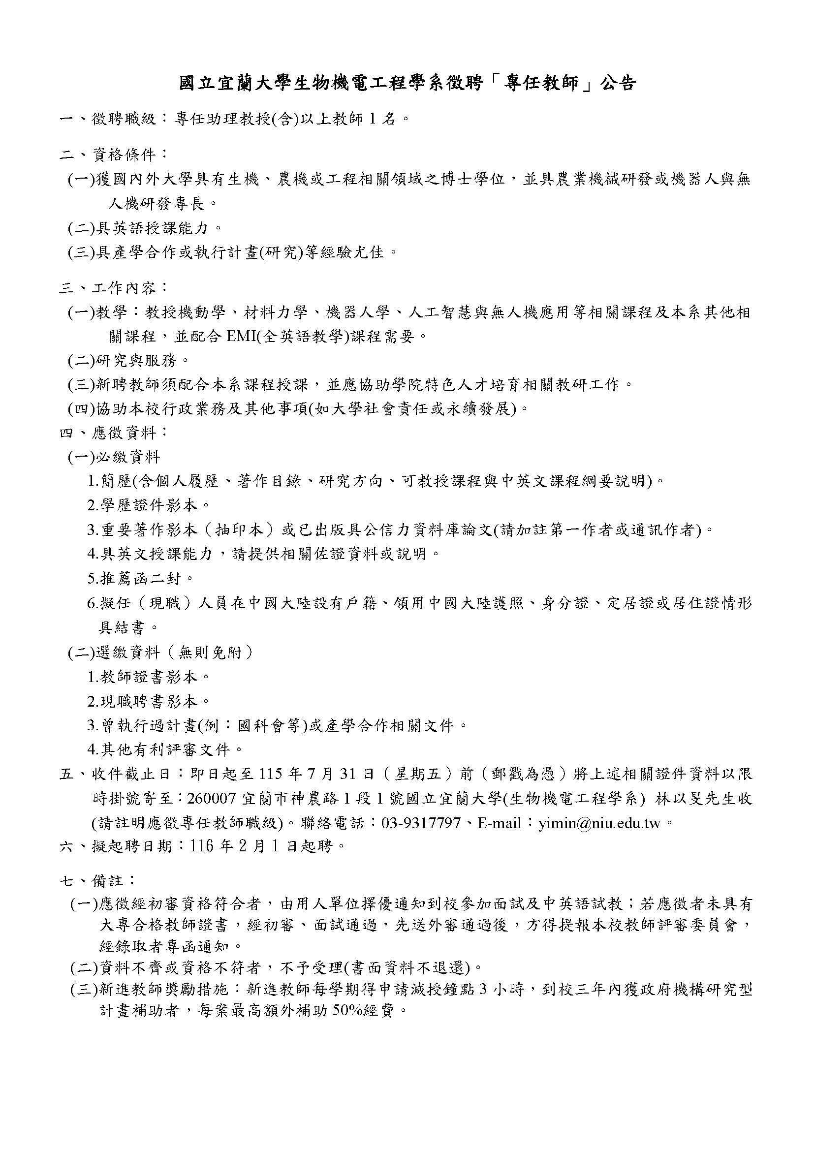 國立宜蘭大學生物機電工程學系徵聘「專任教師」公告 1名