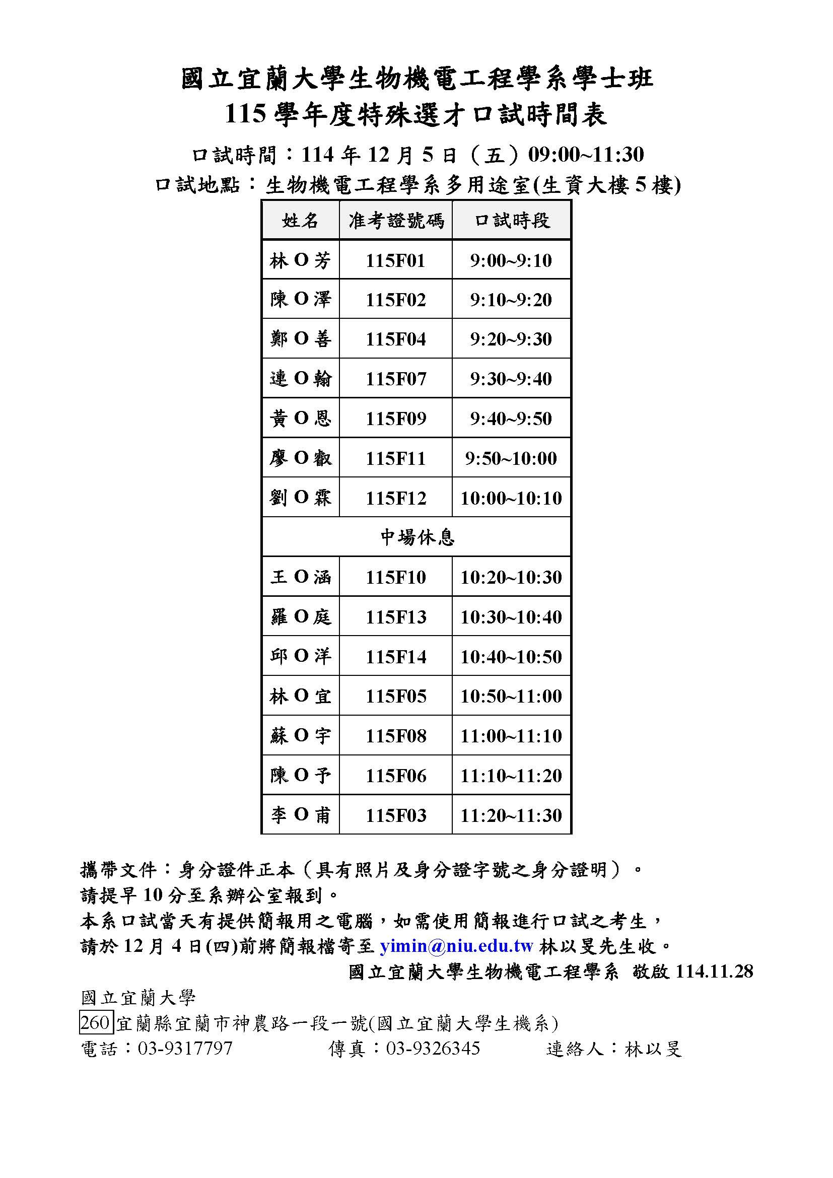 國立宜蘭大學生物機電工程學系學士班115學年度特殊選才口試時間表